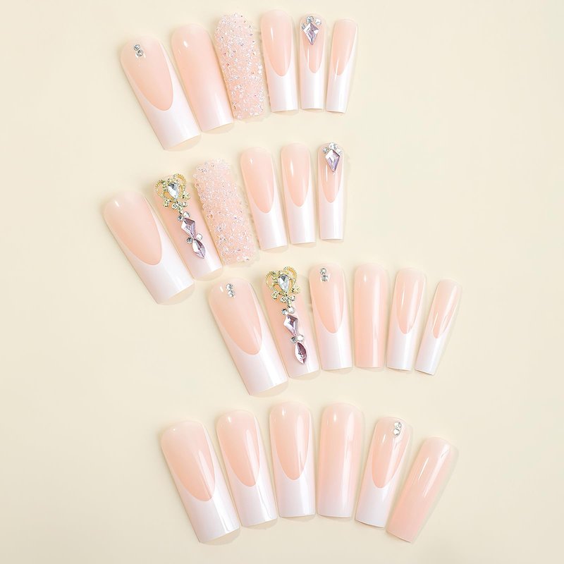 ROFIBUT French Tip Press on Nails Long Square Fake Nails with 3D Rhinestone Designs Bling Broken Diamond Full Cover Glue on Nails Glossy Nude Pink Heart Charms Acrylic Nails for Women Girls 24Pcs