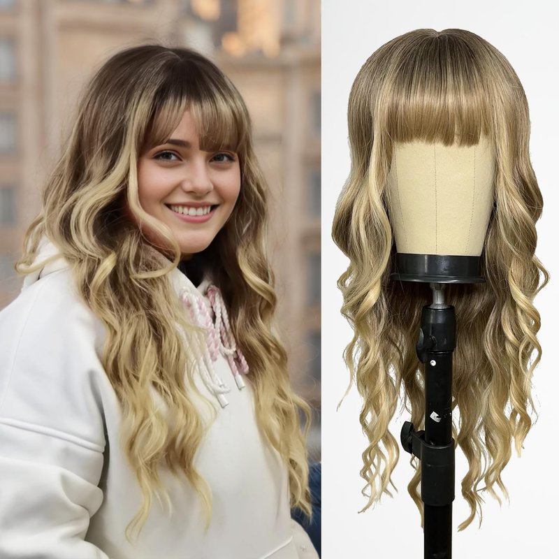 Romantic Angels Blonde Wig with Bangs for Women Long Wavy Ombre Blond Wig with Dark Root Synthetic Wigs for Girls Daily Party Use 26 Inches