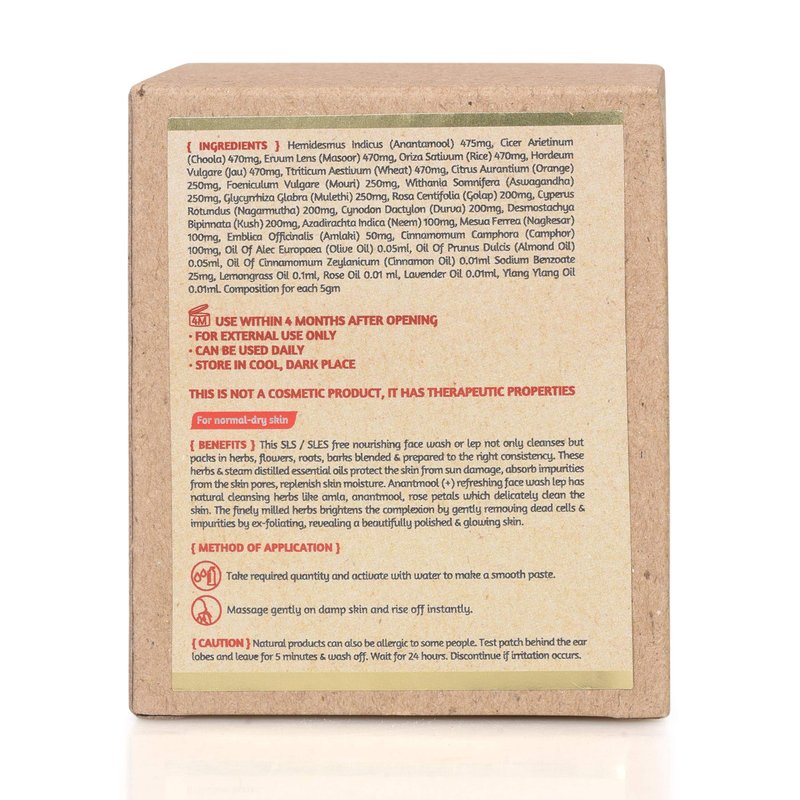 Application: Add adequate quantity, mix with water to form a smooth paste. Message gently on damp skin & wash off.