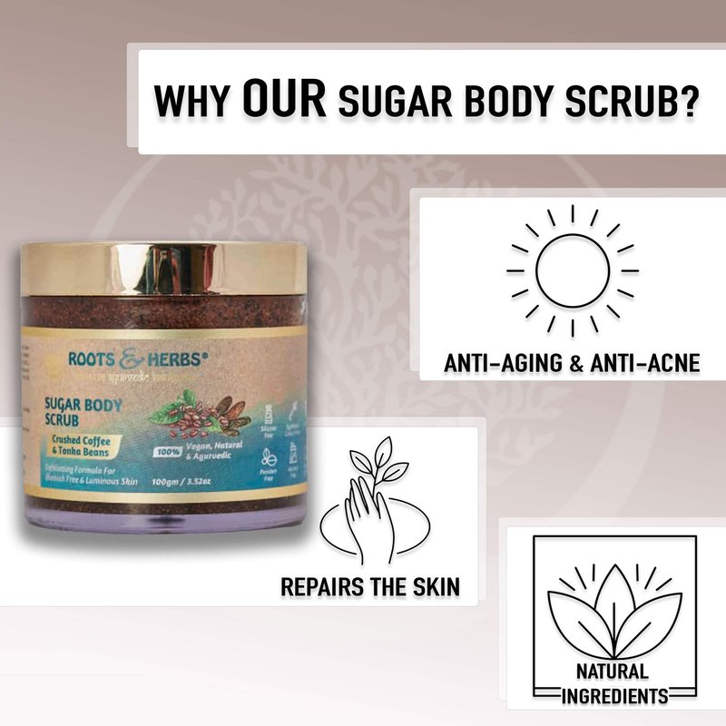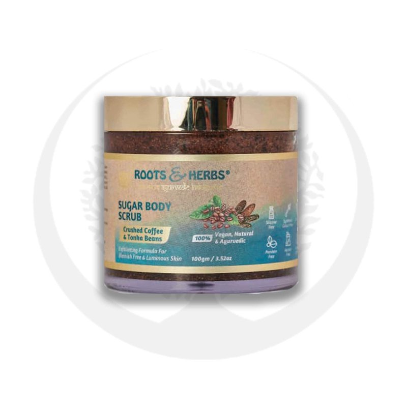 Roots and Herbs brings you Sugar Body Scrub (Crushed Coffee & Tonka Beans), Crushed Coffee & Tonka Beans Sugar Body Scrub which helps get rid of blackheads, tan and impurities. It offers an overall nourishing touch and reduces stretch marks. This BODY scrub comes paraben free and fully vegan. Ingredients: Crushed Coffee, Tonka Bean, Nagarmotha, Baobab Oil, Almond Oil, Argan Oil, Cane Sugar, Sodium Benzoate, Tonka Bean E.Oil, Vanilla E.Oil, Skin Type: All Skin Type. Application: Take a required quantity of body scrub and make a smooth, thin paste with any suitable liquid like sour curd/milk/water. Apply all over the body and leave for 15-20 mins. Soften with water, massage and rinse. Do not wipe off.