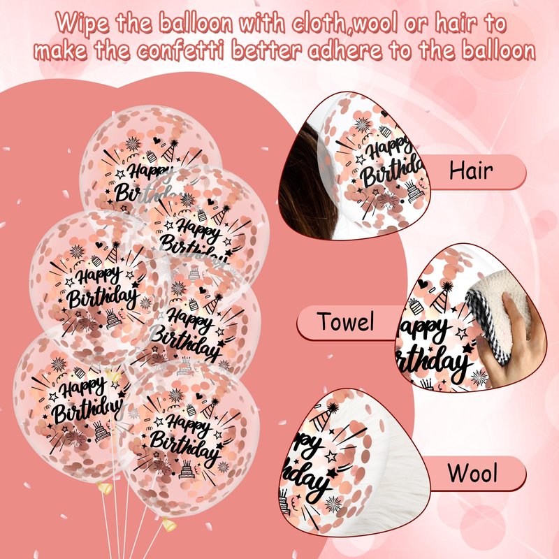 - 【 Birthday Balloons】: This birthday balloons set includes 6 pieces of rose gold balloons,6 pieces of confetti balloons and 6 pieces of black balloons, each balloon is printed with exquisite patterns, and there comes with a roll of rose gold ribbon