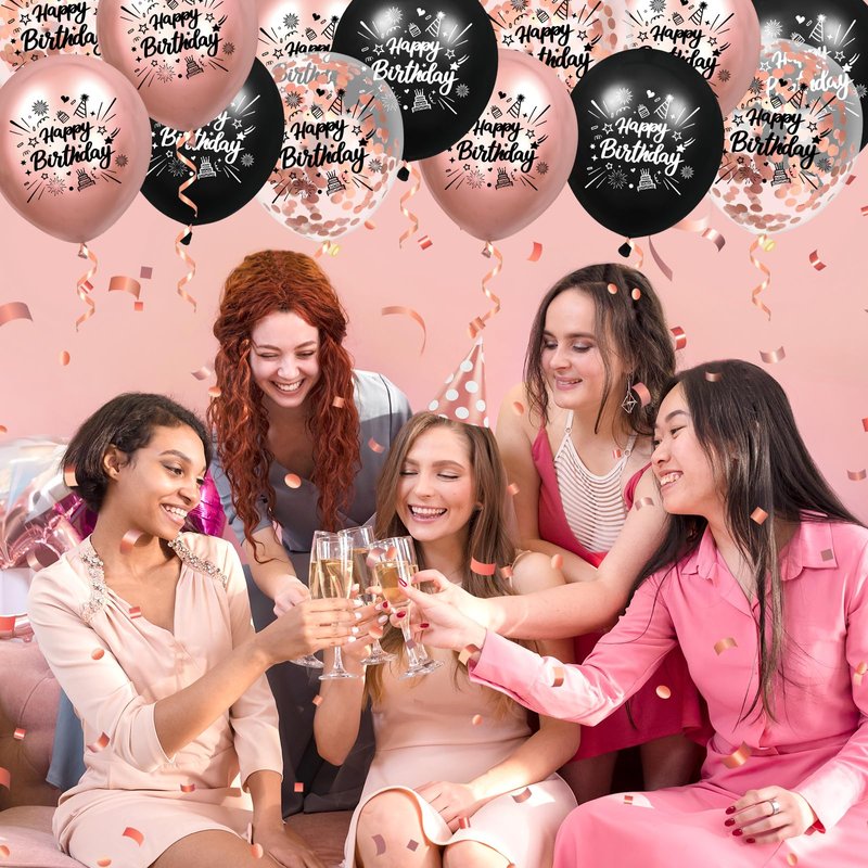 - 【 Birthday Party Decorations】: “Romantic rose gold” + “mysterious black” + “featured confetti” latex balloons as birthday party decorations, everyone will praise after seeing them, rose gold birthday balloons are essential decorations for birthday party which can be used as a photo background for everyone to record the loving