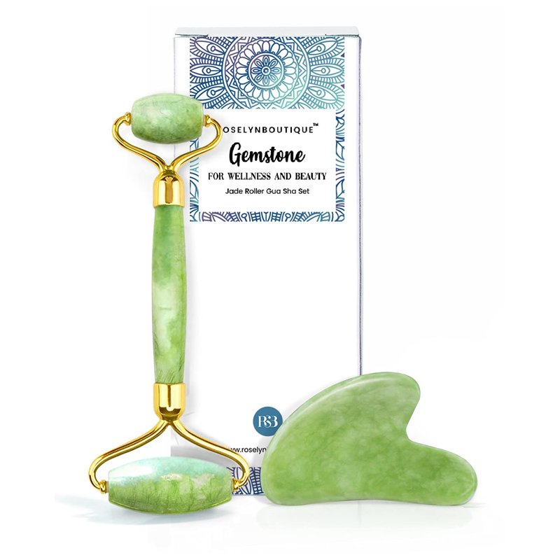 ROSELYNBOUTIQUE Jade Face Roller Gua Sha Facial Tools - Face Massager Guasha Skin Care Tool for Men Women (Green w Jade Roller)