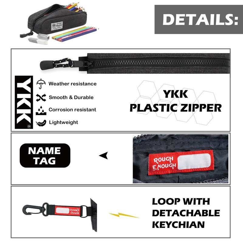 - Convenient Keychain Holder:Rough Enough canvas pencil case pouch comes with a black keychain holder that features name tag clips for hanging on school bags or personal items.This makes it easy to keep your small pencil case organized and accessible at all times. The keychain holder also adds a touch of style to the canvas pencil case, making it a great addition to your everyday carry