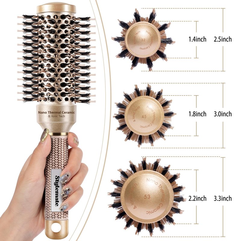 - Nano Ceramic Ionic Technology: Transform your styling routine with our round hair brush, engineered for superior shine and smoothness. Natural boar bristles distribute oils for lustrous hair, while ionic technology minimizes frizz and damage. The evenly-heating ceramic barrel reduces blow drying time, making your styling faster and healthier. Upgrade to salon-quality results at home