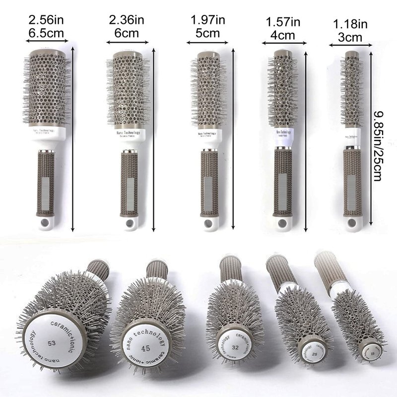 small round brush for bangs: Length, About 9.8in/25cm. Diameter, 0.75in/19mm(barrel); 1.37in/35mm(include teeth). 1 inch round hair brush: Length, About 9.8in/25cm. Diameter, 1in/25mm(barrel); 1.77in/45mm(include teeth). Medium round hair brush: Length, About 9.8in/25cm. Diameter, 1.3in/32mm(barrel); 2in/52mm(include teeth). Round brush for blow drying Stylish Circle Brush, travel brush The volume brush barrel will be heated quickly when blow drying. Air vent design not only make the heat evenly, also let the air flow take away the water that attached hair in multi direction. Reducing Drying Time.