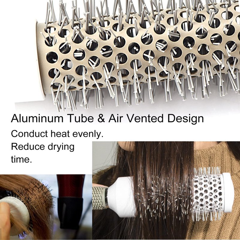 - Ceramic round brush for blow drying, the aluminium barrel absorbs the heat from the blow dryer quickly and the vented design allows air to flow freely for even heat distribution to help you dry hair faster and style hair easily.The Ceramic coating reduces hair frizz, make your hair smooth and shine.