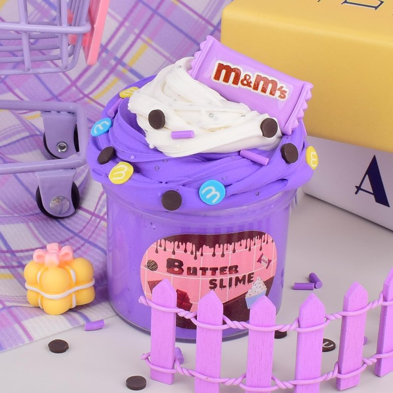 - 🍰Fun Candy Slime Kit:4 pack butter slimes(pink, blue, white, purple), 4 realistic candy accessories, 1 pack of foam, 1 pack of candy chips, 1 candy packaging box