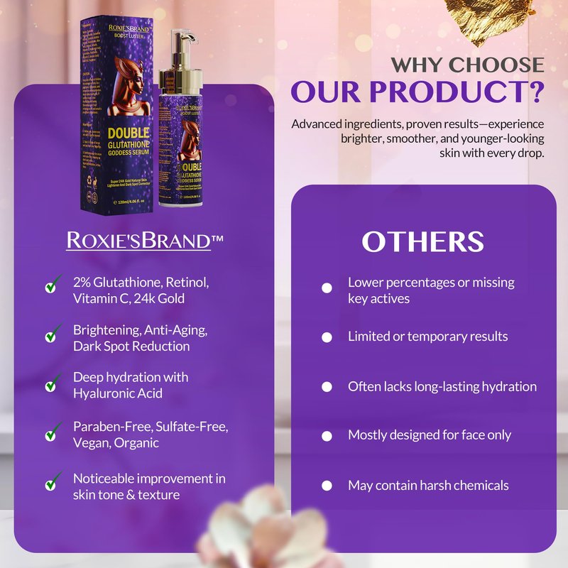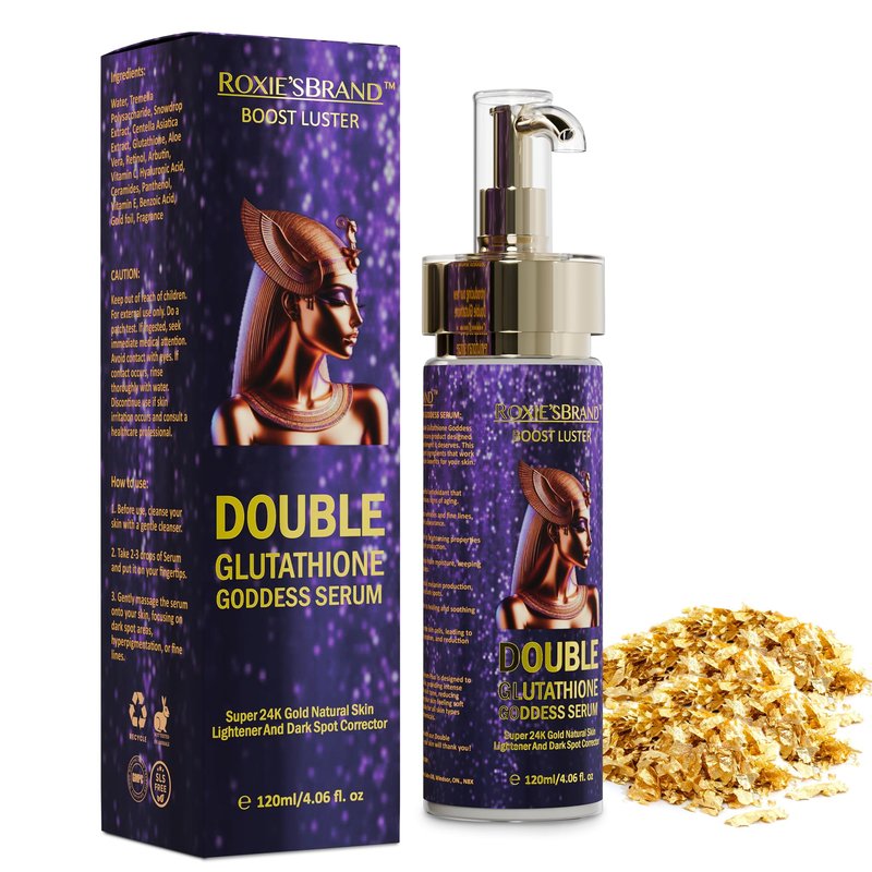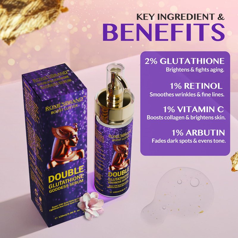 ROXIE'SBRAND Boost Luster Double Gluta Goddess Serum: 2% Glutathione, 1.0% Retinol, 1.0% Vitamin C, 1.0% Hyaluronic Acid, 1% Arbutin, 24k gold (120ml /4.06 fl. oz.)