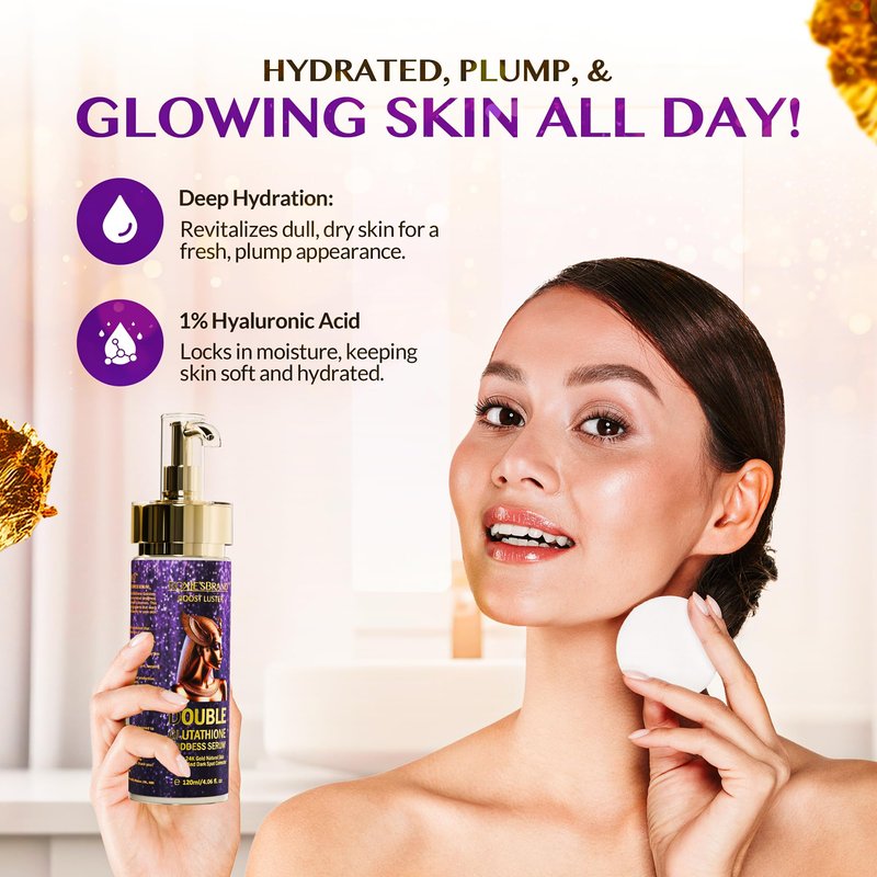 Introducing our new Double Glutathione Goddess Serum, a revolutionary skincare product designed to give your skin the nourishment it deserves. This serum is packed with potent ingredients that work together to provide multiple benefits for your skin.