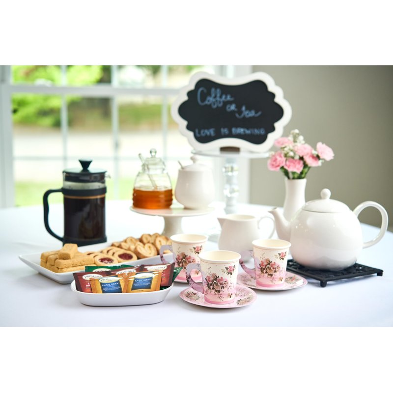 - Set of 24 Pink Tea Party Supplies - Elegantly host up to 24 friends & and guests with this beautiful tea party decor by Royal Bluebonnet. The set includes 24 disposable tea cups with handles and saucers. Plenty for your princess tea party, bridal shower tea party, floral baby shower, and your tea for two birthday party decorations.