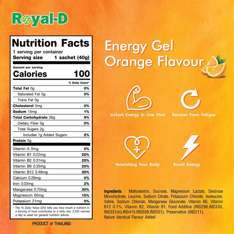 📦 20 x Royal-D Energy Gels slim disposable sachet 1 flavor (Orange) (1.41 oz.) - 20 x Royal-D Energy Gels slim disposable sachet orange flavor (1.41 oz.) Add to cart and start your day with a full energy boost!
