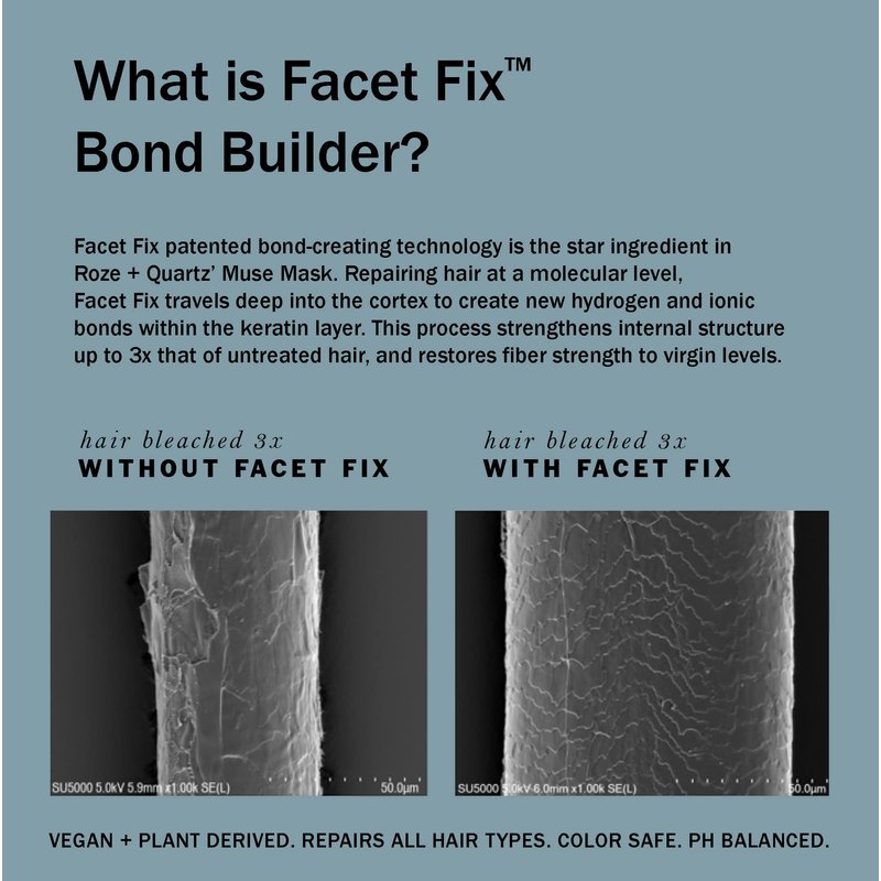 - Facet Fix patented bond builder repairs at a molecular level; it strengthens internal hair structure up to 3x that of untreated hair, creates additional hydrogen and ionic bonds within the hair’s keratin structure, penetrates deep into the cortex and restores fiber strength to levels of virgin hair.