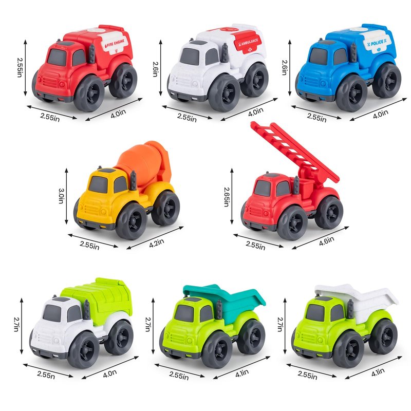 - 【8 in 1 Trucks Toys Set】8 in 1 truck toys set, including 2*fire truck & ambulance & cement mixer truck & 2*dump truck & police cars & garbage truck.The reduced version of the truck toy can better stimulate children's curiosity and encouraging hand-eye coordination. Different in shapes and bright colors of truck cars deeply attract children' attention and cultivate their patience and observation. allow your baby to recognize and identify 6 types of cars.