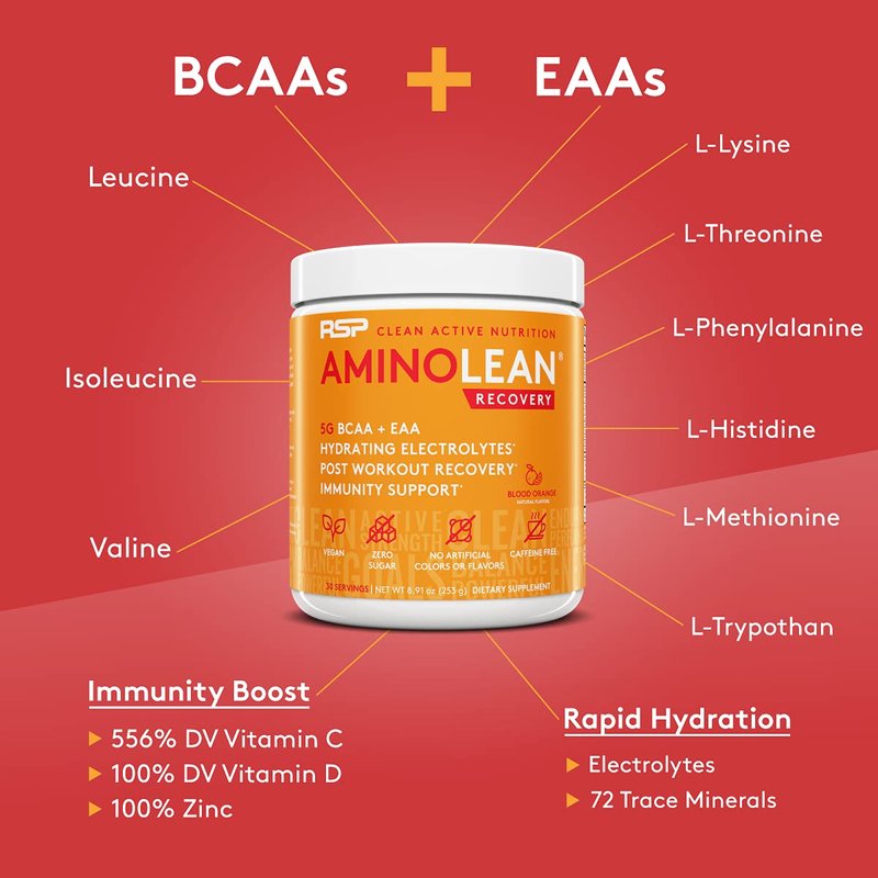RSP AminoLean Recovery - Post Workout BCAAs Amino Acids Supplement + Electrolytes, BCAAs and EAAs for Hydration Boost, Immunity Support - Muscle Recovery Drink, Vegan Aminos, Blood Orange…