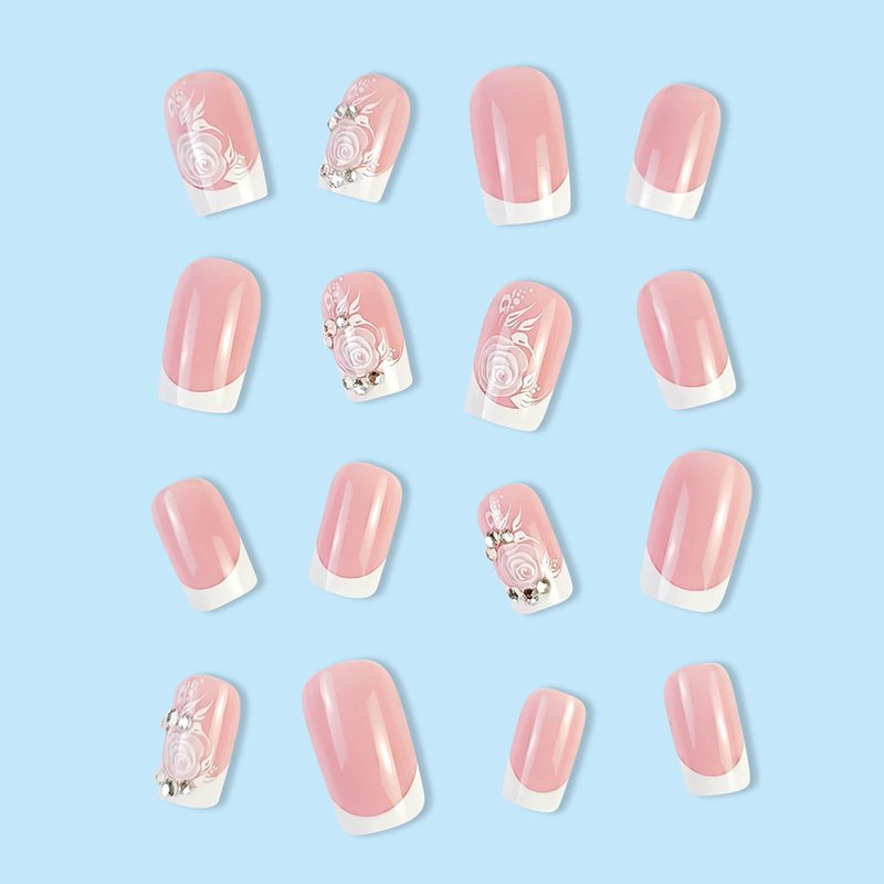 RTKHFZE Square Press on Nails Medium French Tip Fake Nails with Rhinestones & Flowers Designs Full Cover False Acrylic Nails for Women & Girls 24Pcs Artificial Nails