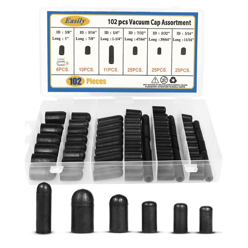 Rubber Vacuum Caps Plug Kit, 102 PCS Assorted Vacuum Plugs Hose End Caps Assortment Kit for Carburetor, Manifold, Automotive 3/16'' 5/16" 7/32" 1/4" 5/32'' 3/8''