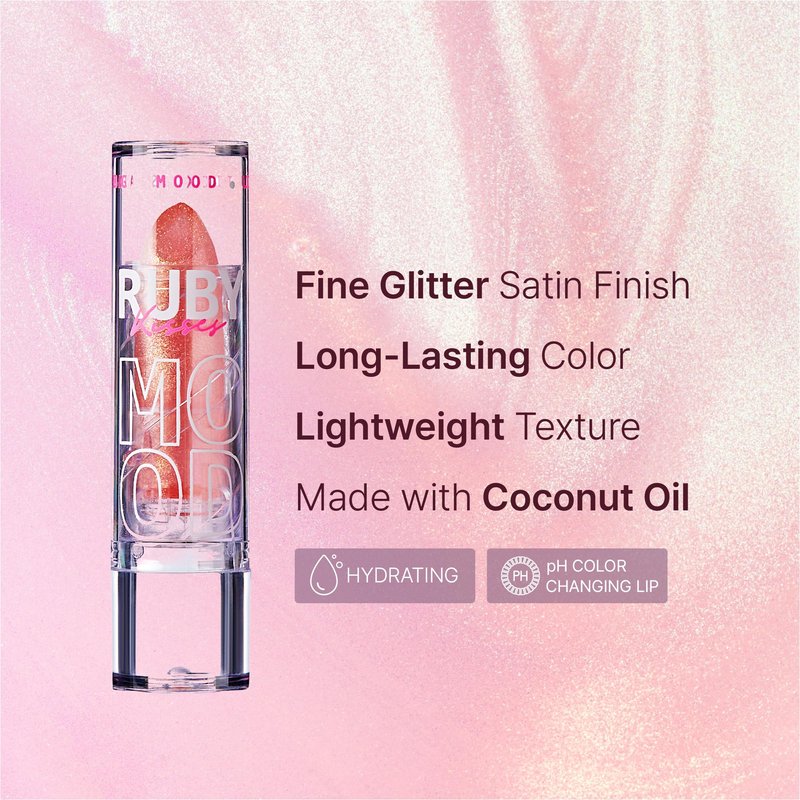 Ruby Kisses Staining Mood Lipstick, Prestige Glitter pH Color Changing Lipstick, Lightweight Hydrating Formula with Coconut Oil, Long Lasting Satin Finish Color