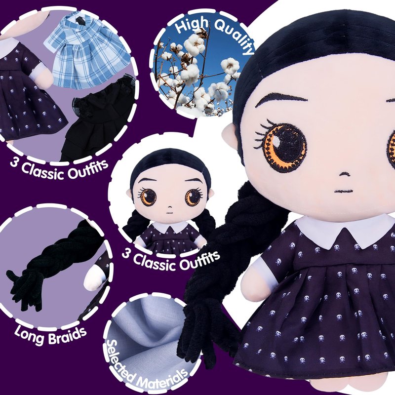 - š¤ćUnique Designć: This doll is both a plush toy and a dress-up toy. Three beautifully designed dresses, one is an everyday black floral dress, one is a classic prom cake dress and the other is a uniform dress. The skirts are all handmade with exquisite workmanship and good quality. In addition, the invisible Velcro makes the skirts easier to put on and take off.