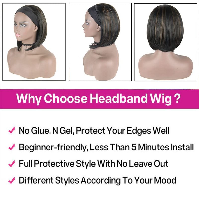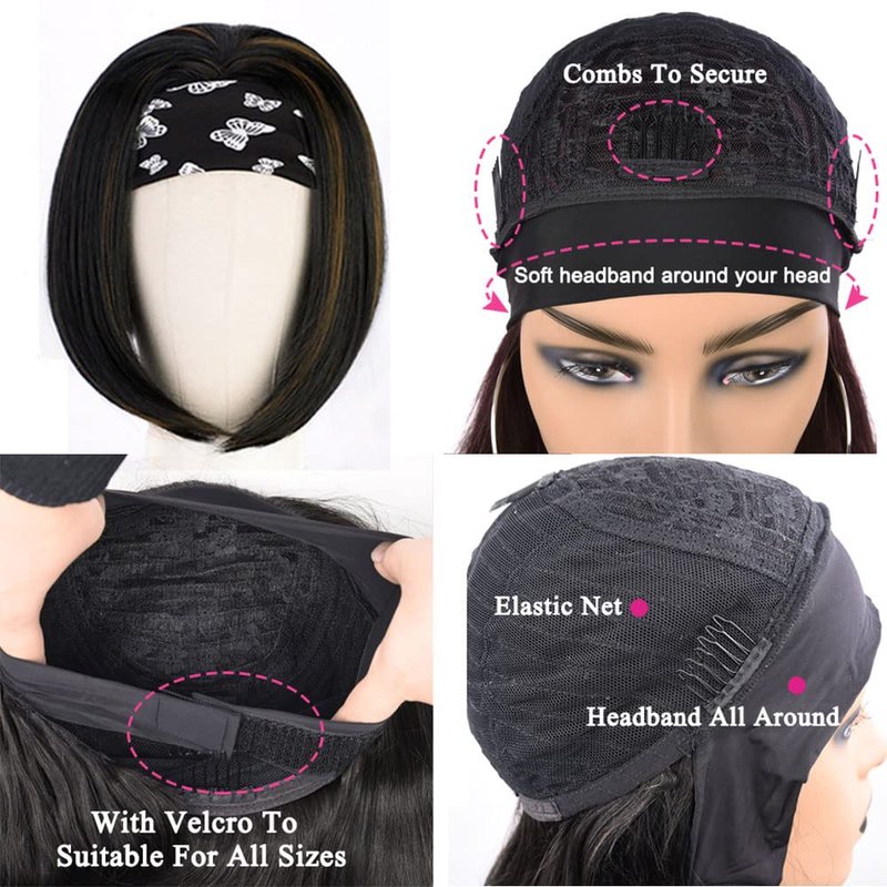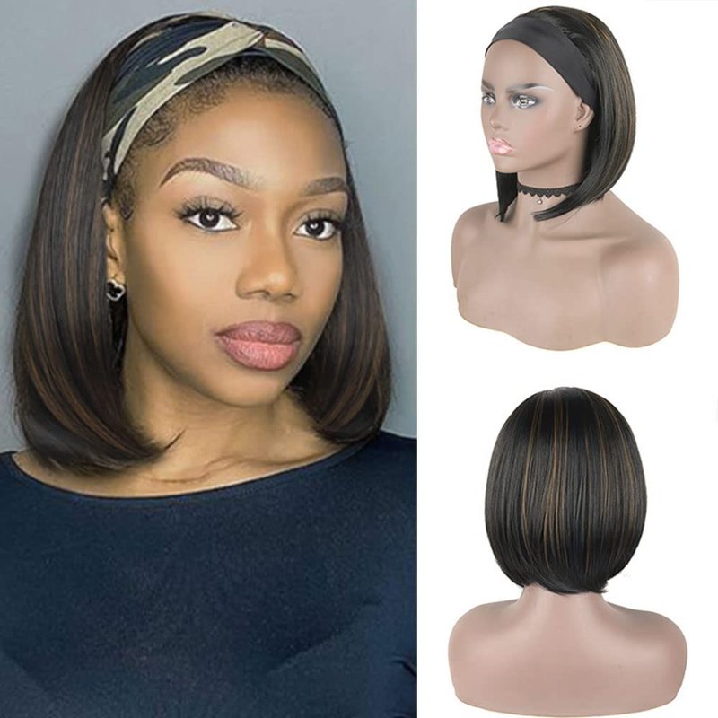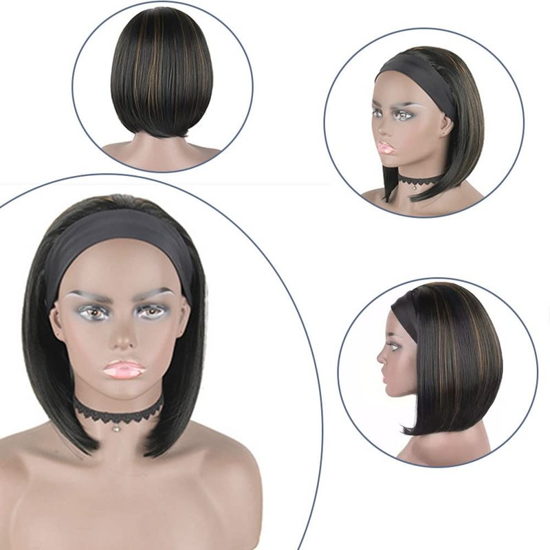 Headband Wig Details Material:Soft heat resistant synthetic fiber hair Color: Black mix Brown Length:10inch inches straight bob wigs Density: 150% density that looks thick and beautiful Cap Size: Circumference 22-23inches with 1 Velcro 2 adjustable straps and 3 combs Wig type: Full machine made wig Package:1*headband wig with one headband and a cap How to care your headband wig? 1. Detangle hair gently by hands before washing.Do not rub or twist hair 2. It is normal that there is few strand shedding when comb it with fingers at the first time 3. Wash and condition the hair with moisturizing hair care products at least every 1-2 weeks 4. Don't restyle the hair too often too hard,or the hair will easily get dry and the knots will be damaged 5. Have hair to dry naturally.Do not expose to sun or dry by hair drier.Put essential oil to soft hair after wash