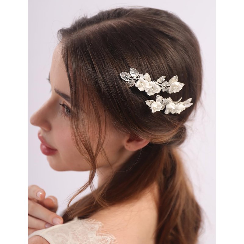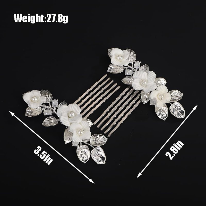 Rumtock 2pcs White Flower Silver Leaf Hair Comb Set for Wedding Brides Women Handmade Boho Jewelry
