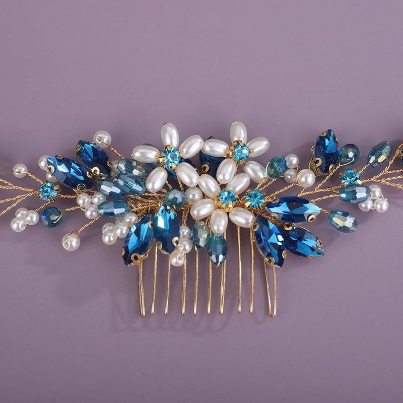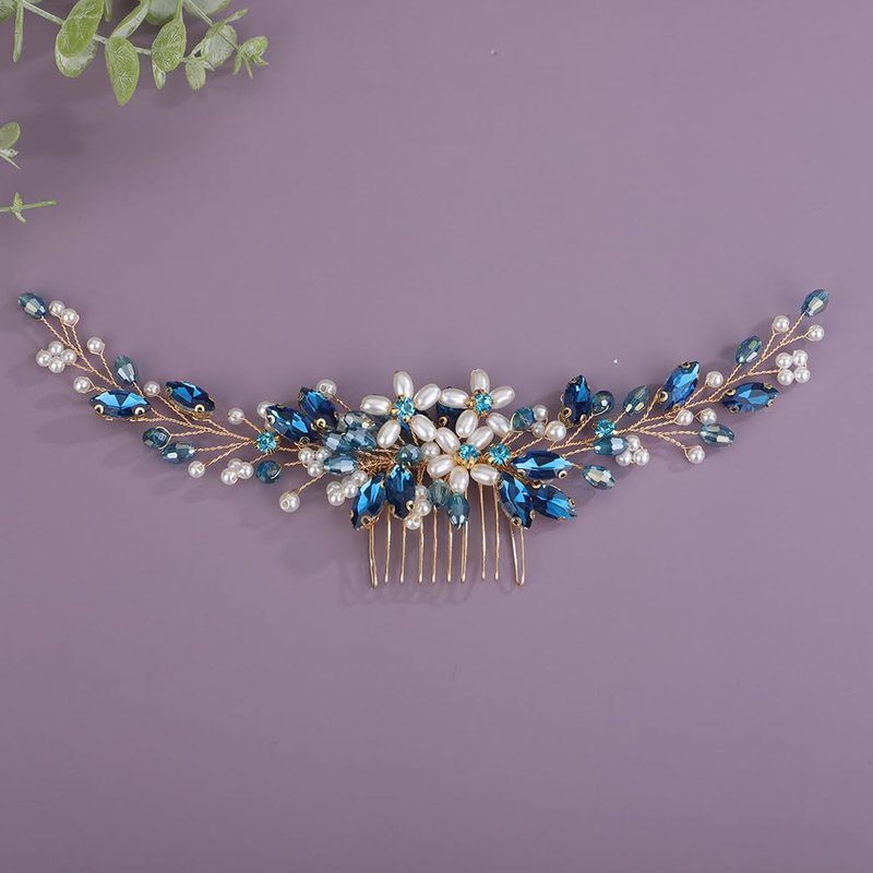 Rumtock Blue Rhinestones Beads Pearl Flower Long Hair Comb for Women Girls Wedding Bridal Boho Hair Piece Hair Styling Jewelry (Lake)