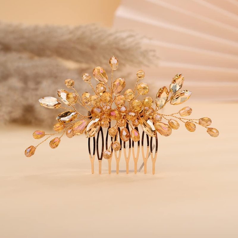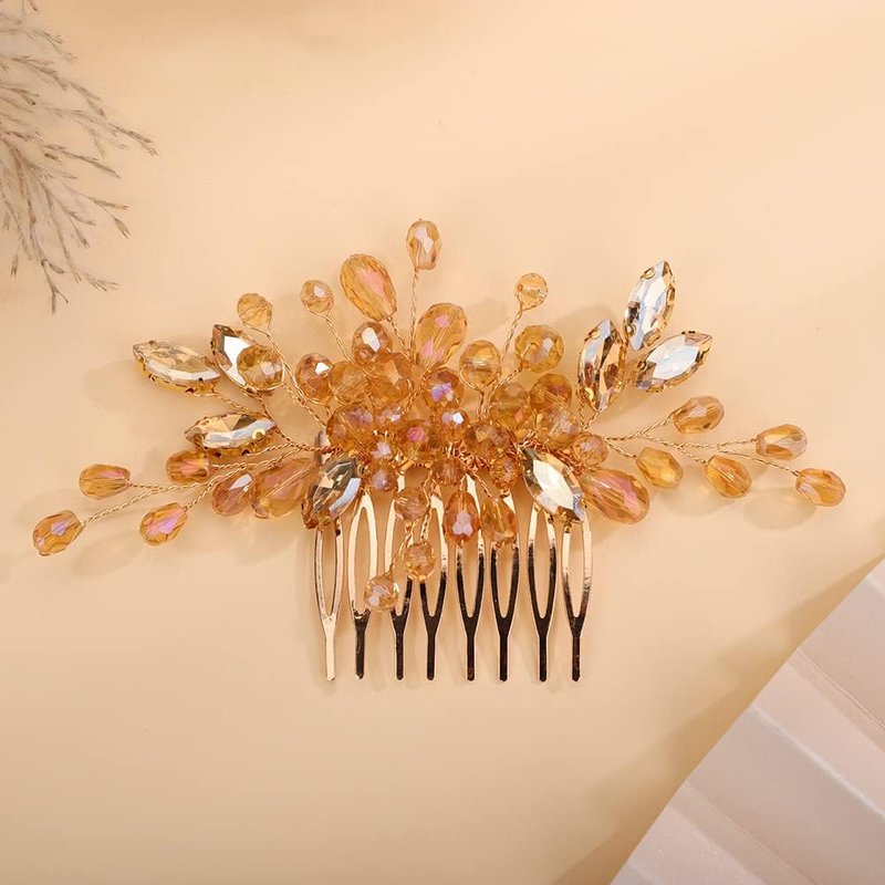 Rumtock Champagne Rhinestones Beads Gold Hair Comb Side Headpiece for Wedding Brides Women Girls Handmade Hair Accessories (Champagne)