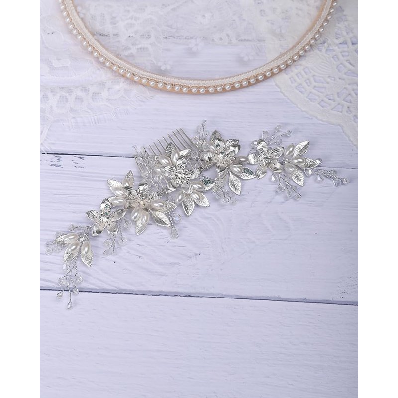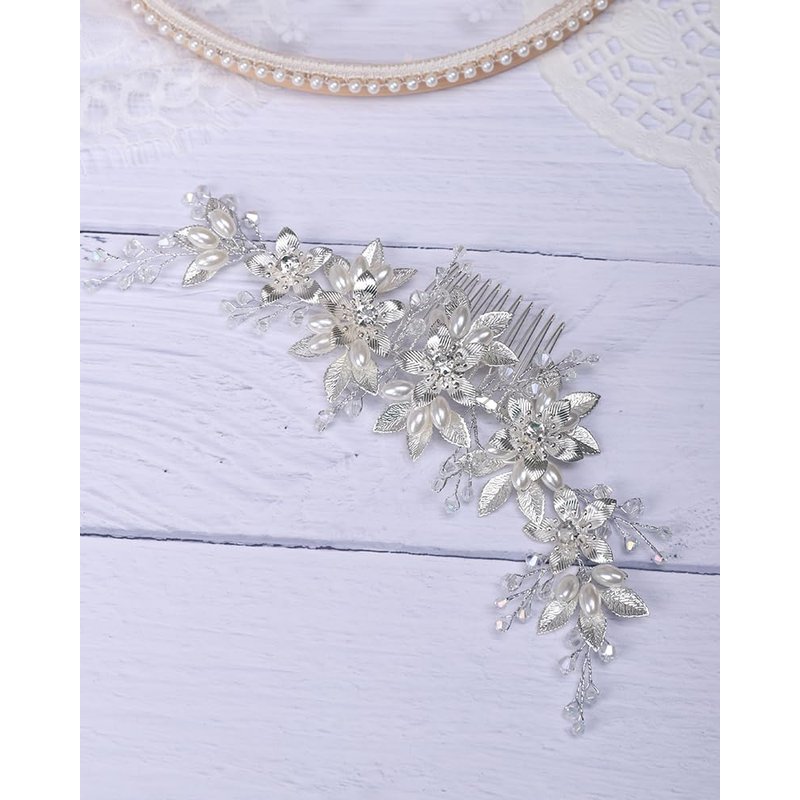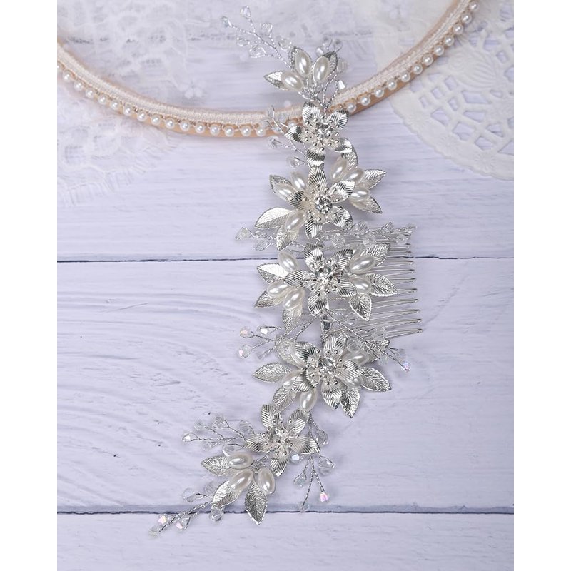 Rumtock Silver Flower with Crystal Hair Comb Long Side Headpiece for Wedding Brides Bridesmaid Women Girls Banquet Prom Handmade Jewelry