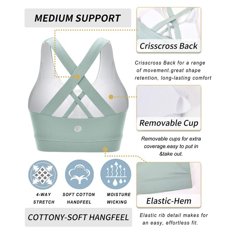- WHY WE MADE THIS:Need a sports bra that does it all? Look no further! This sweat-wicking cross-strap bra gives you the coverage and support you need for yoga, run, and the gym—without restricting your movement or breath. fabric has added lycra that allows the bra to stretch with you and retain its shape over time. Slip in optional, removable cups for full coverage—if you want it. This bra is intended to provide medium support for great shape retention, long-lasting comfort.