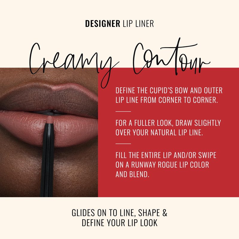 Available in a glamorous mix of red, pink, nude, brown, and berry shades, our liner works seamlessly with your favorite Runway Rogue lipstick, lip gloss, and liquid lipstick. To get a professional-inspired runway pout, apply the liner to hydrated, exfoliated lips. First, define the highest point of your cupid’s bow, then work your way out toward the corners of your lips. Line your lower lip from one corner to the other. For a fuller lip look, draw slightly over the edge of your natural lip line. Fill in your entire lip, or run your favorite Runway Rogue lip color across your lips and blend the color out. Always recap the liner securely after use to protect the formula.