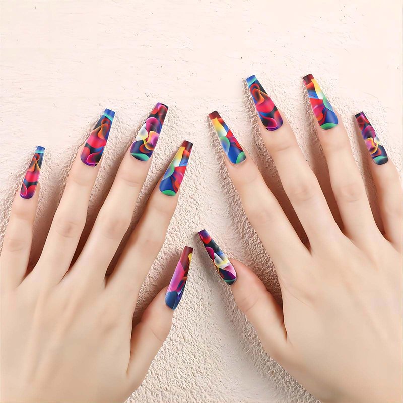 RUOKEXIN Acrylic Press on Nails Long Coffin Fake Nails with Nails Glue Long Ballet False Nails with Water Ripple Rainbow Designs Colorful Full Cover Artificial Nails Press Ons Stick on Nails 24Pcs