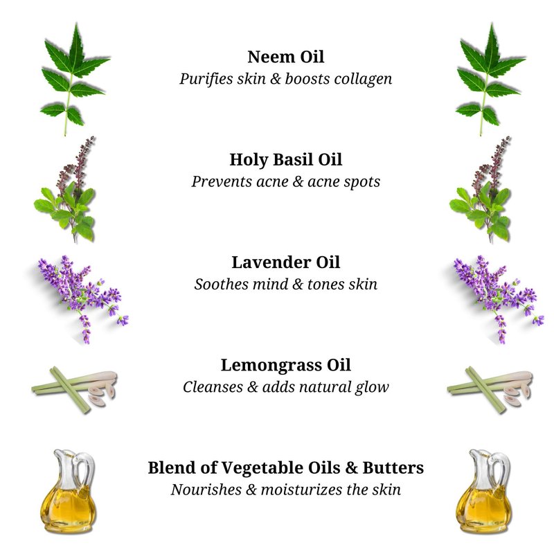- Gentle yet effective formula for acne-prone skin made with real neem, tulsi (basil), lavender & lemongrass.
