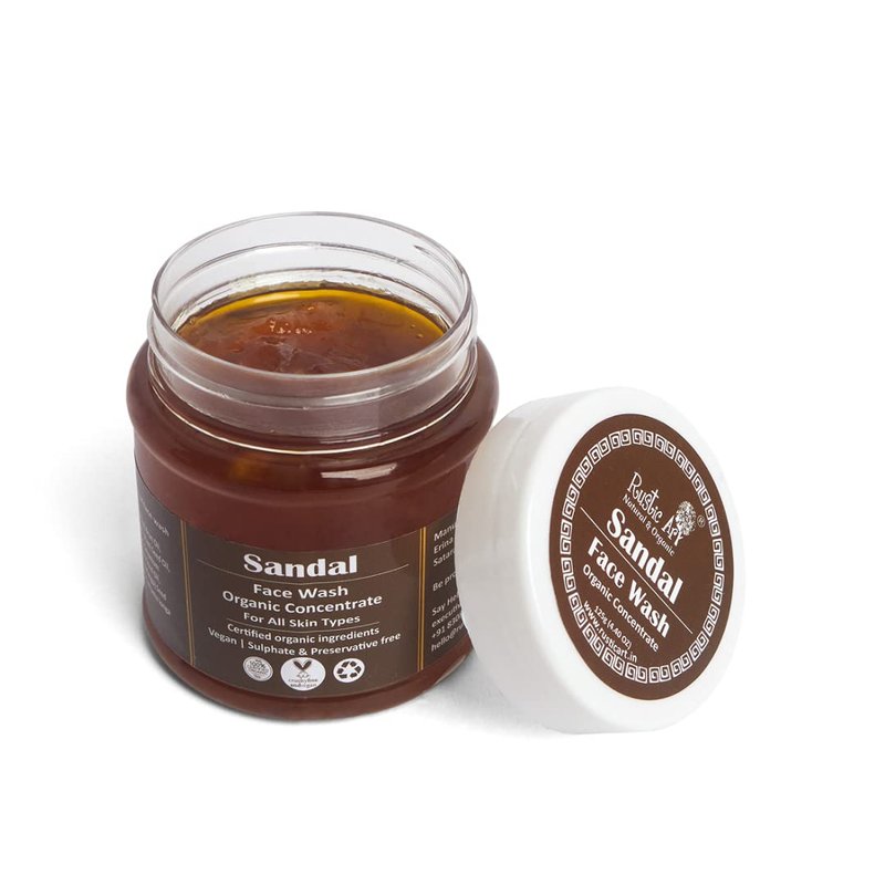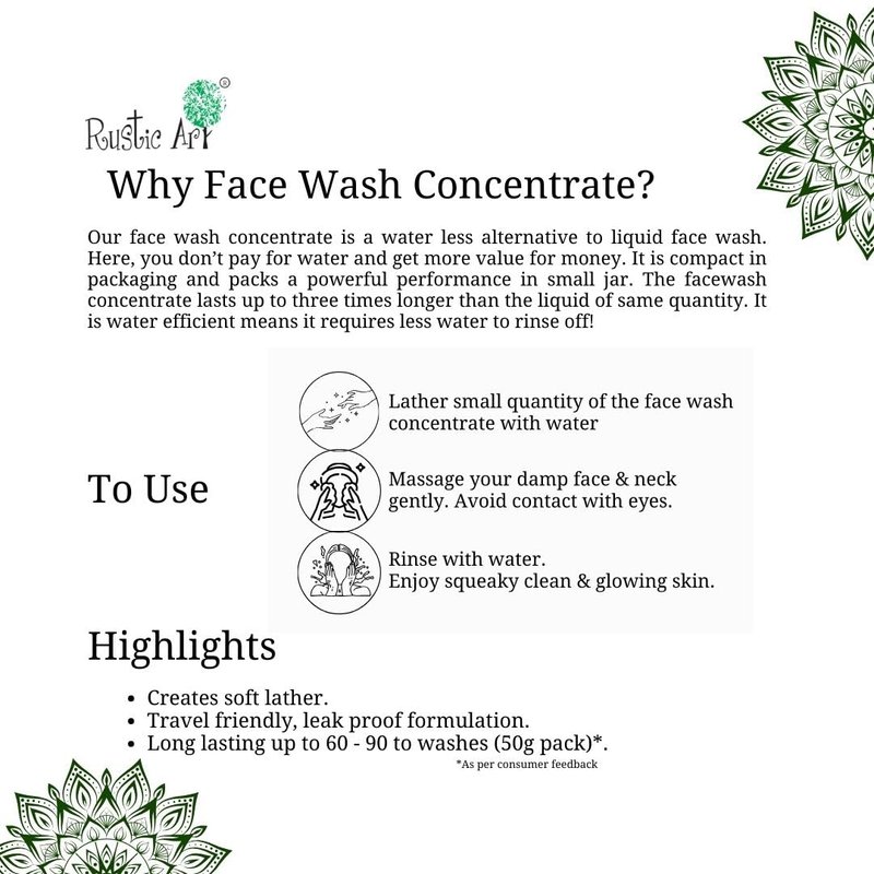 Discover a Calming Cleanse: Rustic Art Sandal Face Wash Concentrate Experience the Power of Nature: Our face wash concentrate harnesses the wisdom of nature with Sandal, Turmeric and Mango Butter, ingredients known for their ability to reduce blemishes, prevent acne and whiteheads, remove tan, and leave a refreshing cooling effect. Soothe & Refresh: Infused with soothing Lavender and refreshing Lemongrass essential oils, this face wash gently cleanses without irritation, leaving your skin feeling calm and invigorated. Suitable for Combination and all Skin types: Formulated with organic and natural ingredients, this vegan cleanser is perfect for all skin types, even those with combination skin types. Lasts 3X Longer: Our concentrated face wash formula delivers up to three times more washes than a regular liquid face wash of the same size. This means less waste and more bang for your buck! Clean & Natural: We believe in clean beauty, free from harsh chemicals. Our face wash concentrate contains no sulphates, parabens, synthetic colors, or artificial fragrances. Travel-Ready: Compact and leak-proof packaging makes this face wash concentrate perfect for your on-the-go lifestyle. Water-Conscious Formula: The concentrated formula itself is water-less, reducing the amount of water needed for production and transportation. Additionally, it requires less water to rinse off during use, further minimizing your water footprint.