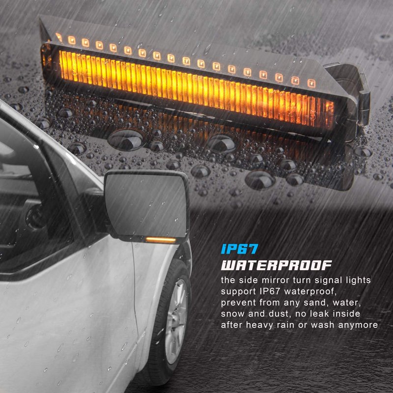 • FLOWING LED LIGHTING DESIGN: Equipped with 48 LED, amber LED strip and flowing mode give your truck a much cleaner look, super bright light output maximize driver and passenger sides illumination, a best replacement for the old or burnt out factory side mirror turn signal light