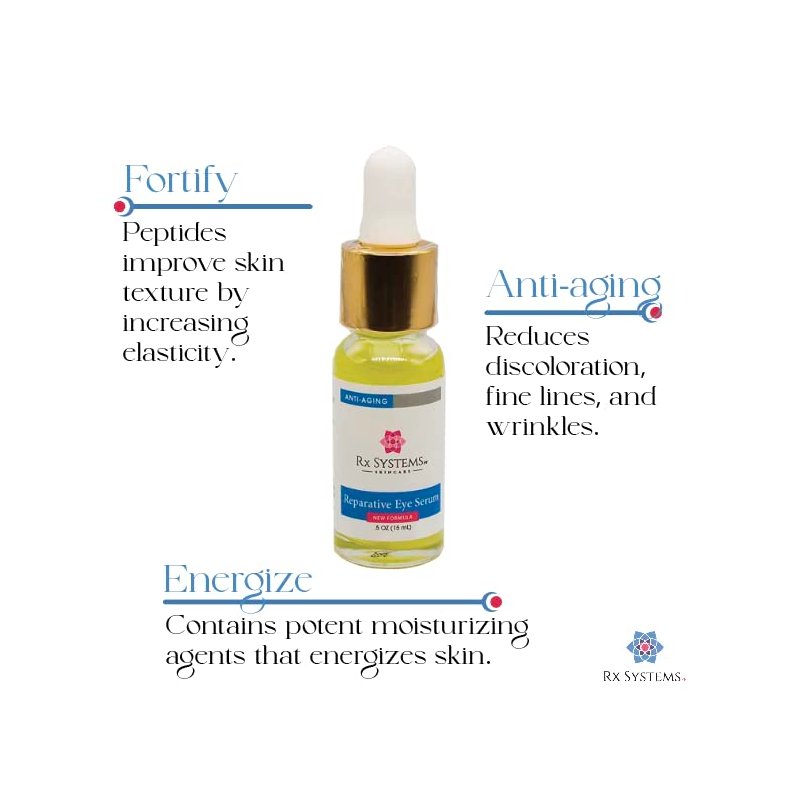 Introducing the Reparative Eye Serum from Rx Systems PF, the perfect solution for your aging eye concerns. This powerful eye serum is specifically designed to target wrinkles and fine lines around the delicate eye area. With 8 different peptides, this serum works to promote collagen production, leaving your skin looking firm and youthful. Enriched with plant extracts, this vegan formula is free from parabens and silicones, making it safe for all skin types. Say goodbye to under eye puffiness and bags with this eye cream specially formulated to reduce puffiness and dark circles. Our eye serum is your go-to for anti-aging wrinkles and under eye dark circles. Don't let your eyes give away your age, let our wrinkle serum for eyes work its magic. This serum is perfect for those seeking an anti-aging eye serum with no fillers. Get ready to see a noticeable difference in the appearance of your eyes with our eye serum. Try it now and experience the difference for yourself!