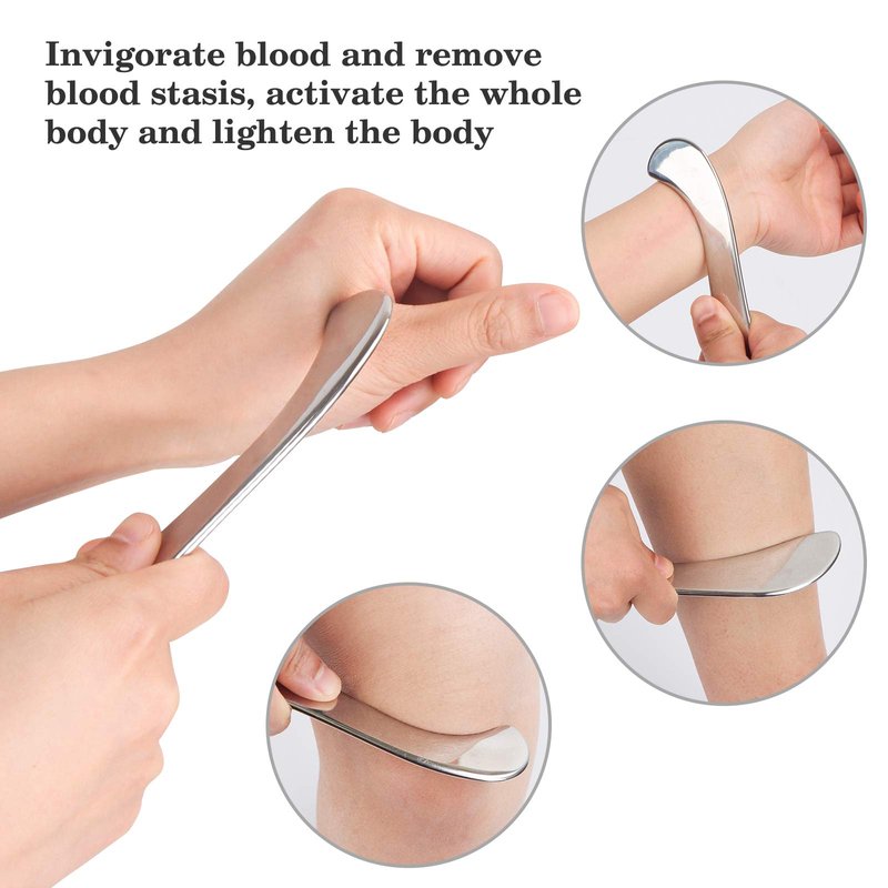 A massage tool designed for the human body A cheap and durable product A massage tool that can be carried with you Product size:7.04 Inch X 1.63 Inch X 0.16 Inch. Excellent material This massage blade is made of 100% medical stainless steel. They are durable, non-static and easy to clean. They just need to be scrubbed with a cloth. No need to worry about broken of Gua Sha Scraping Massage Tool, it is tougher than the stone, jade, buffalo horn scraping massage tool. Body Deep Massage By disposing of the stagnant blood, the gua sha boards help the body create new, healthy blood cells, and as a result, once excess waste is gone, the skin can absorb nutrients and moisture more easily and efficiently. Not only a pain relieving tool, but your skin nourishment and hydrating ally as well. Easy to use You can easily hold it with your hands and start massaging the body. A great gift This is a favorite gift for the most painful people and those who want to detox their whole body. It can make their skin look better.