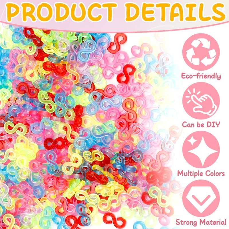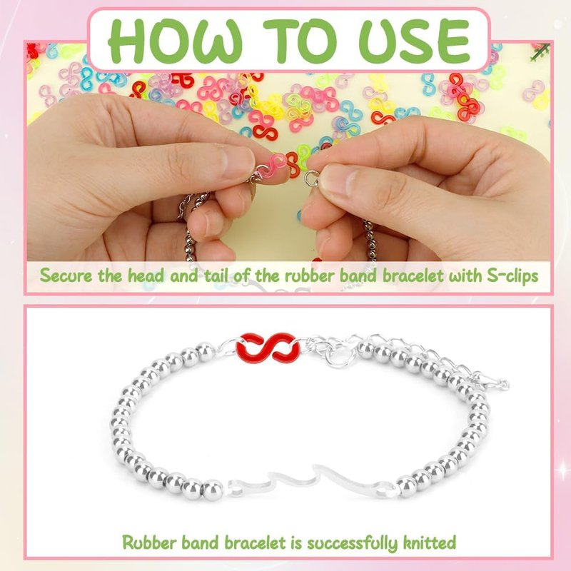 - ENRICH LIFE: Using bracelet clips,loom hooks,small rubber clips,loom bracelet hooks,rubber band hook,plastic connectors to make these rainbow loom bracelets and s hooks closure bracelet,while increasing our hands and brain ability,let us get a sense of achievement in the process of doing it,enriching our spare time and increasing the happiness of our life.Bracelet connectors,bracelet rubber bands,clips for bracelets,rubber bands bracelet,s shaped hooks for bracelets.