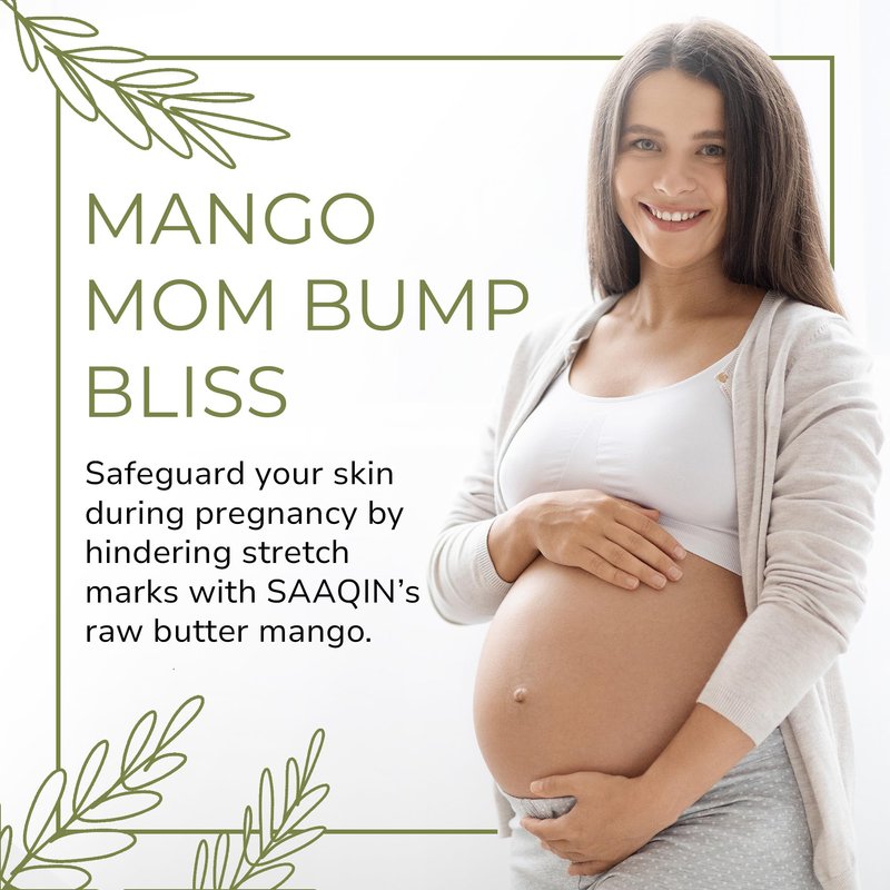 - Mango Mom Bump Bliss - Safeguard your skin during pregnancy by hindering stretch marks with SAAQIN’s raw butter mango. Its enriching formula nurtures your skin, maintaining elasticity and resilience. Embrace the journey to motherhood with a radiant and flawless complexion.