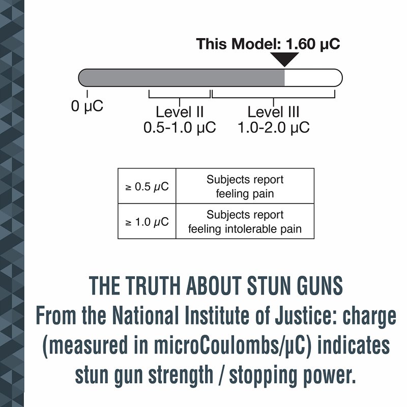 - EXTREME STOPPING POWER: Stun gun delivers a painful 1.60 µC (Microcoulombs) charge to maximize your self-protection when faced with an attacker; the safety switch prevents accidental discharge. A rubberized grip helps to secure your hold on your stun gun