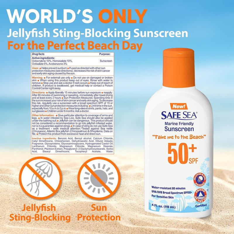 - JELLYFISH STING PROTECTION – Bask in the sun and waves with SPF 50+ sunblock from Safe Sea. Your reef-safe sunscreen helps guard against jellyfish sting, sea lice, swimmers itch and UV radiation. Enjoy your beach day, protected.