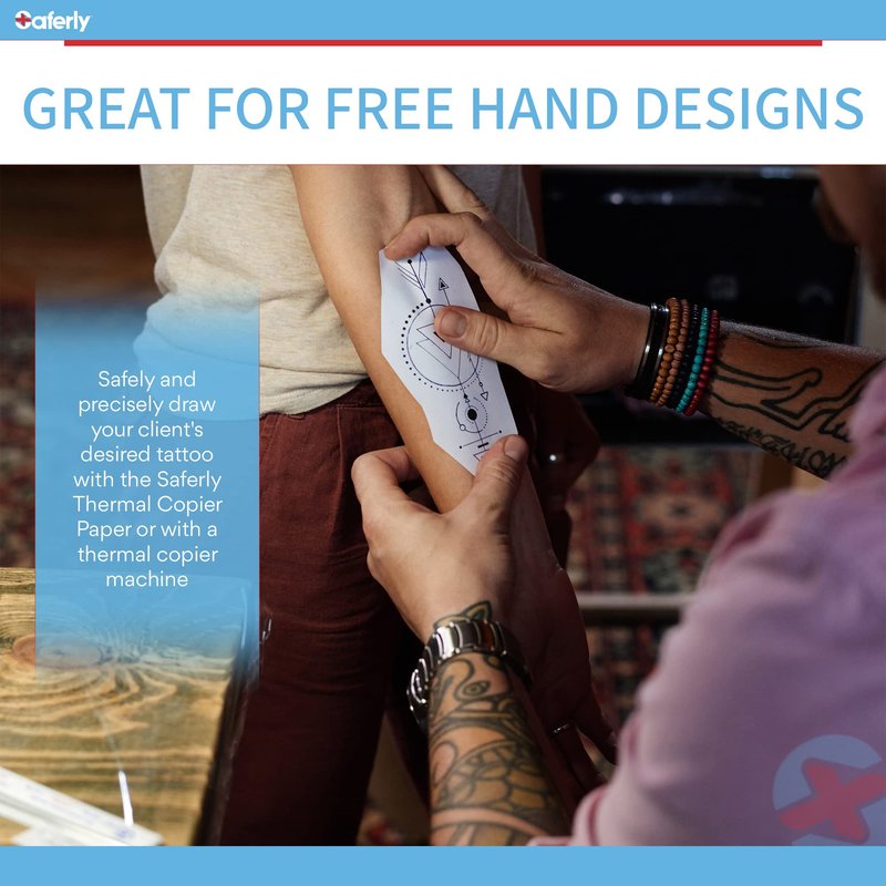 - SAFERLY THERMAL PAPER - A high-quality tattoo transfer paper for printing your tattoo stencils. The transfer paper for tattooing comes in a box of 100 sheets.