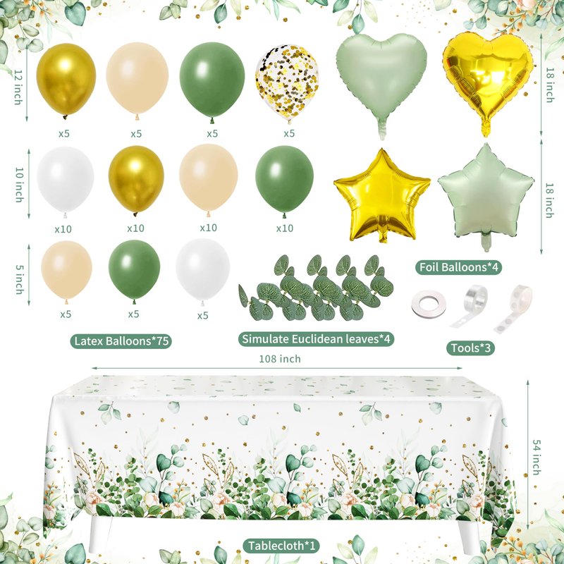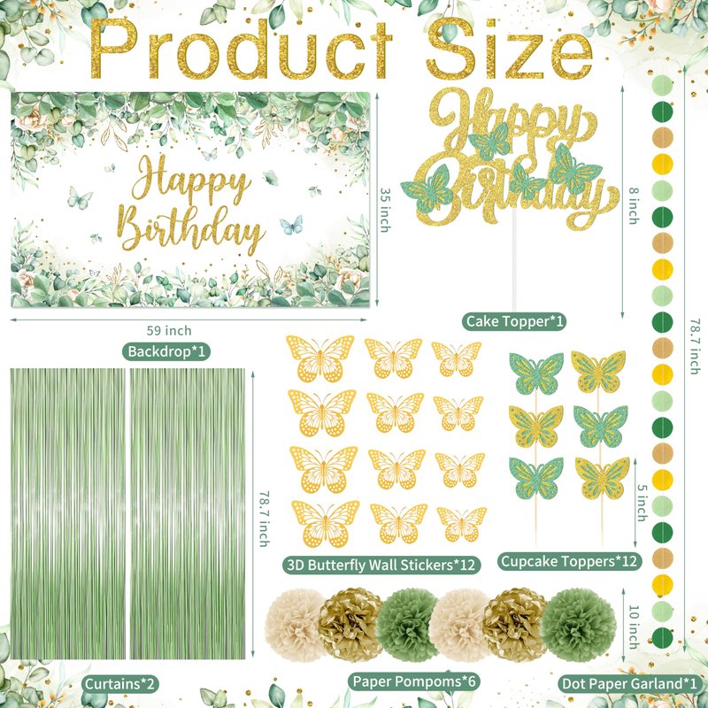- Sage Green Birthday Decoration -- Our kit comes with all you need to make any birthday party special - including 1 Happy Birthday backdrop, 1 tablecloth, 1 sage green dots garland, 2 fringe curtains, 6 paper pompoms, 1 cake topper, 12 cupcake toppers, 12 3D butterfly stickers, 4 artificial eucalyptus stems, 2 heart-shaped foil balloons, 2 star-shaped foil balloons, 75 latex balloons, 3 tools kit (balloon chain, dotted glue, ribbon).