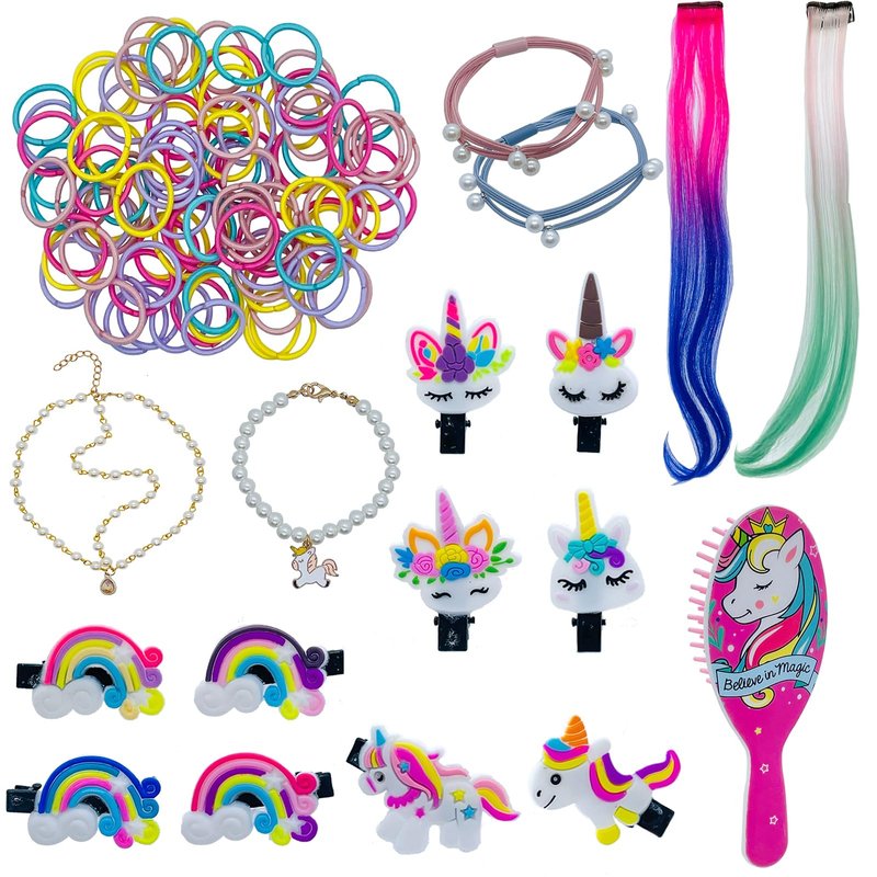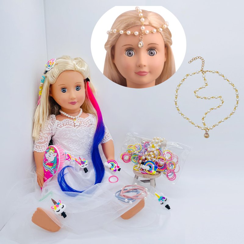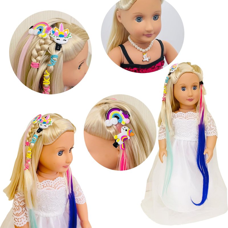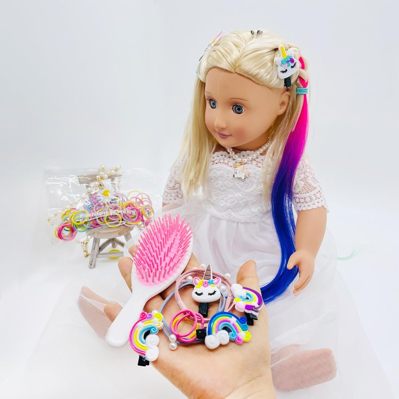 - Doll Hair Accessories include 2 wigs,1 hair brush,10 unicorn hair clips ,1 necklace ,1 pearl tiara,50 samll rubber hair ties ,2 pearl rubber hair ties(not include doll and clothes) .