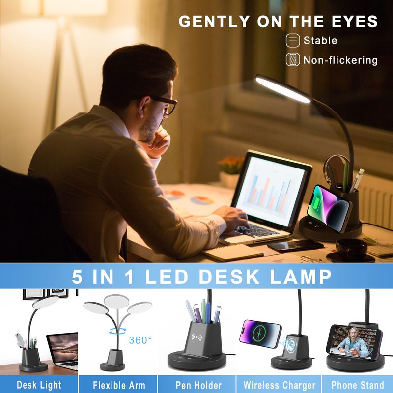- Desk Lamp with Wireless Charger: LED desk lamp with a built-in wireless phone charger and pen holder. This office desk lamp is compatible with iPhones, Samsung, and most devices that support fast-charges smartphone at 10W. You will love this feature to help you to watch movies while charging your phone. The small desk lamp also comes with a 1.8m power adapter, so you don't need to buy adapters separately. A 5V/3A power adapter delivers optimum charging and stable lighting. (Adapter Included)