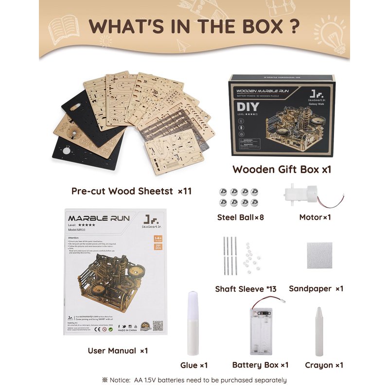 What's in the box? 291x wooden Puzzles 8x Metal Balls 1x User Manual