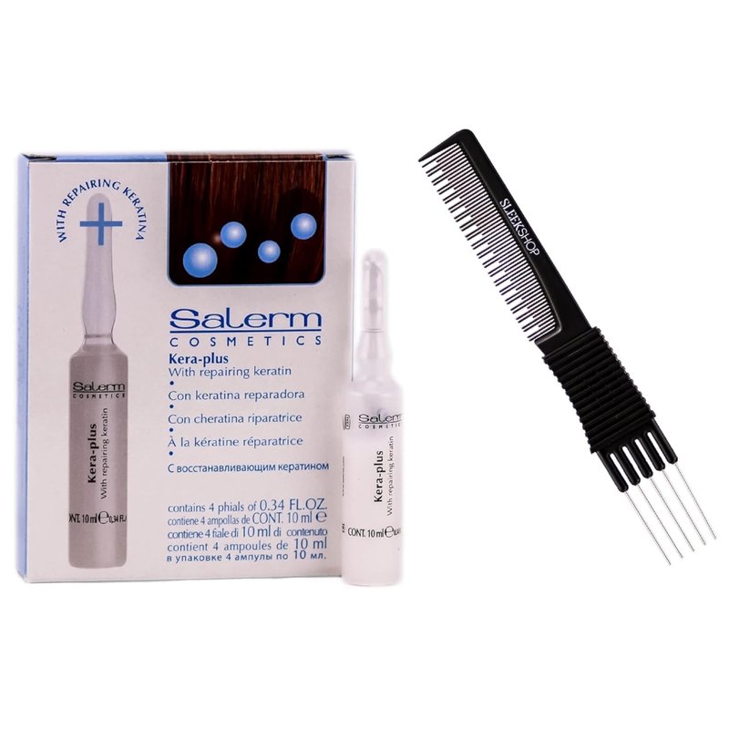 Salerm Cosmetics KERA-PLUS with Repairing Keratin, Straight Hair for Straightening, Protects from Damage Caused by Heat Tools (w/Sleek Teasing Comb) Keraplus + (4 phials of 0.34 oz (PACK OF 1))