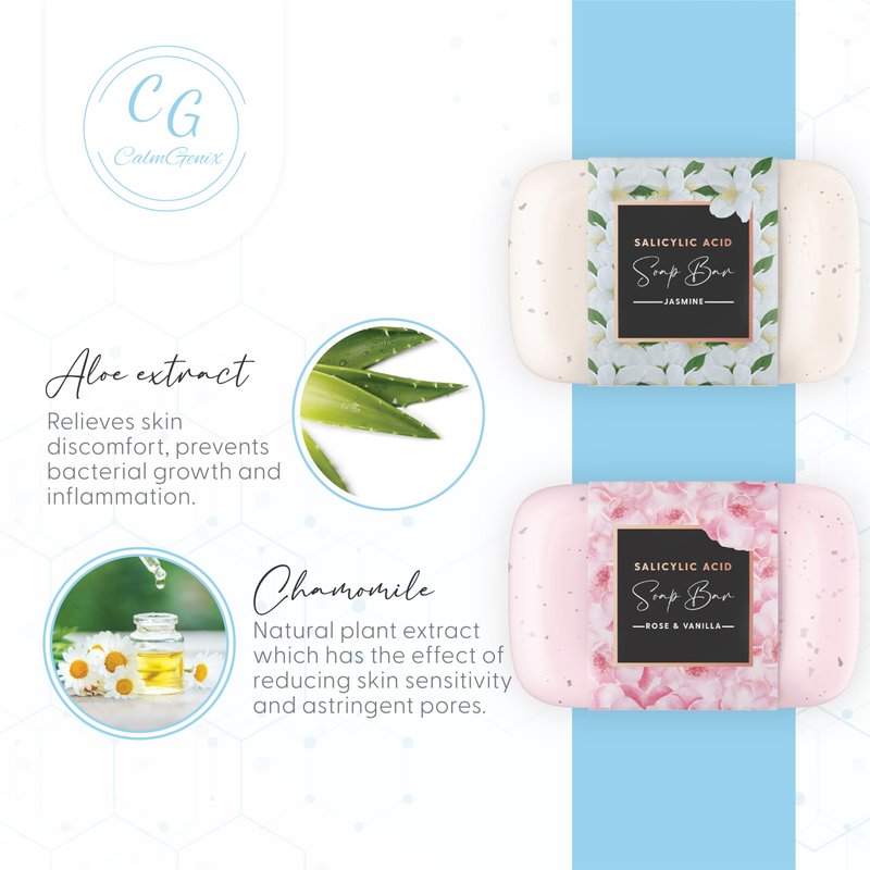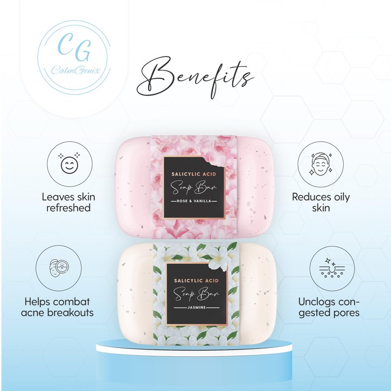 Achieve radiant, clear, and refreshed skin with the CalmGenix Salicylic Acid Soap Bar. Our pack of 2 salycic acid body wash soap bars gives you two indulging scents: Jasmine and Rose & Vanilla, delivering both cleansing efficacy and sensory indulgence.