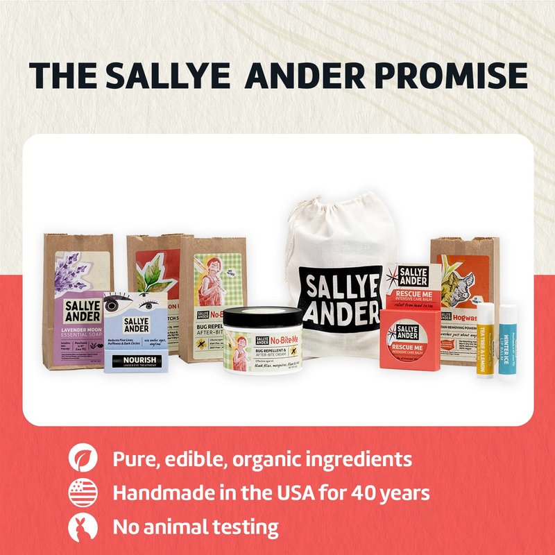 - SALLYE ANDER PROMISE: Since 1982, we’ve been a small family-owned and operated business, committed to producing high-quality natural products, without harmful additives. Everything we make is 100% handmade in the USA from organic ingredients—for happy, healthy skin.