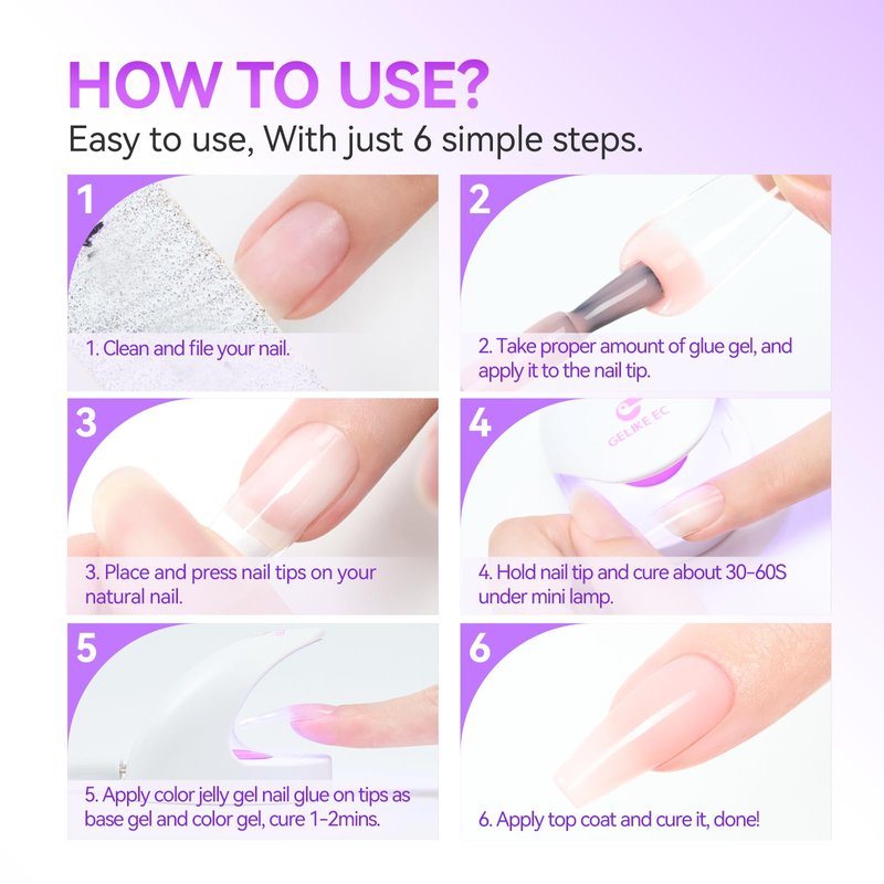 The 6 in 1 Glue is a versatile adhesive that combines uv nail glue for press on tips, rubber base coat, strengthener gel, nail polish, builder gel, and slip solution in one bottle. Could save your money and time, This long-lasting brush on glue is incredibly strong and effective. After curing the glue under a 48W UV/LED lamp for 120 seconds, it adheres firmly and fits well, long lasting for more than 28 days. If you want a perfect nail bed protectiong and foundation, use it as a rubber base coat, it not only strengthens natural nails and nail tips but also smooths dents and unevenness. The natural jelly color polish included makes it easy for beginners to achieve a flawless French manicure at home with salon-quality results. Additionally, the builder gel can be used to sculpt, enhance natural nails, repair damaged nail beds, and extend them to an ideal length.