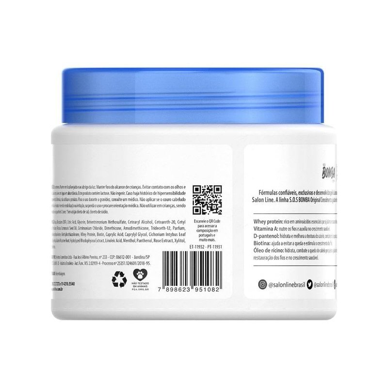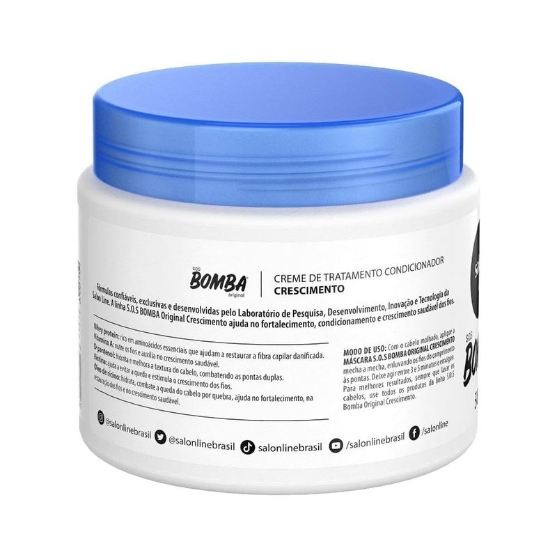 A Mascara de Hidratacao S.O.S Bomba Original conta com formula exclusiva e dermatologicamente testada para hidratar e restaurar as fibras capilares danificadas, alem de garantir desembaraco e auxiliar no crescimento saudavel dos fios.
